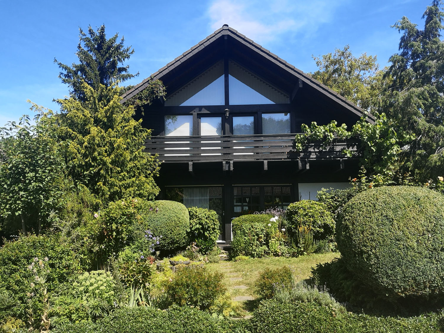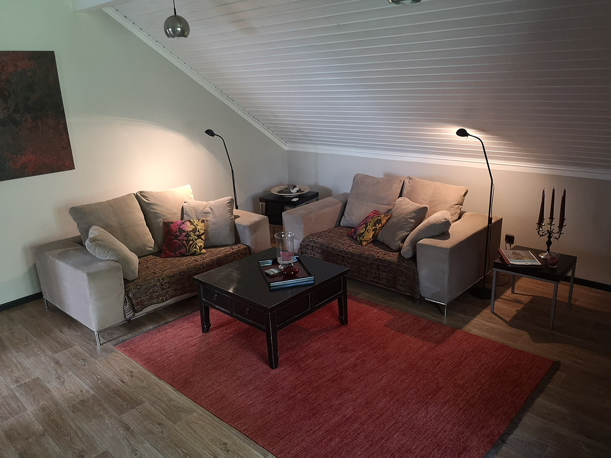 Sie treten im Obergeschoß unseres Hauses in eine kleine Diele mit der Garderobe. Ihre nächsten Schritte führen Sie in das geräumige Wohnzimmer mit Balkon zum Garten und Aussicht auf den Kermeterwald.