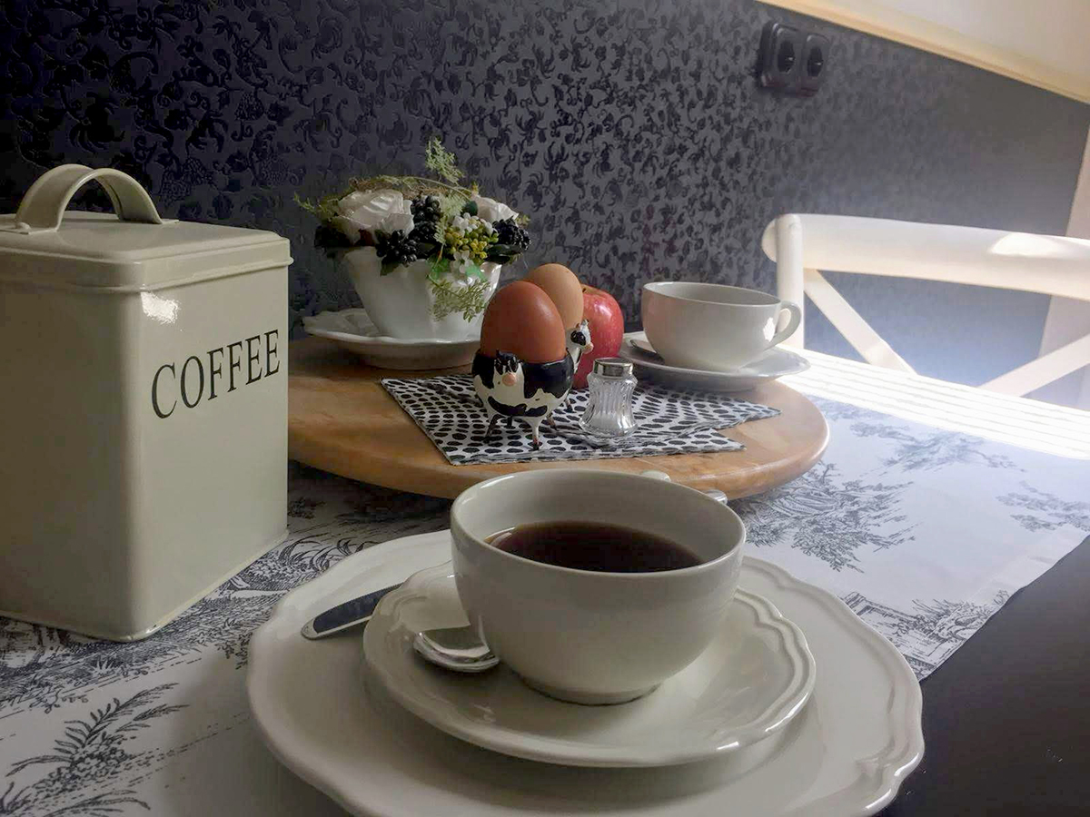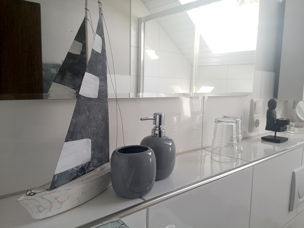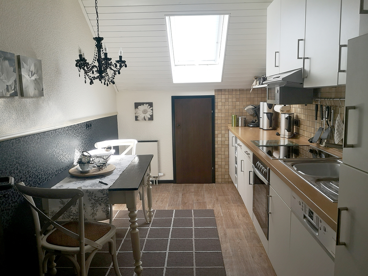 Aus Ihrem Wohnzimmer kommen Sie in die Wohnküche. Die Küchenzeile ist komplett mit allen Gerätschaften ausgestattet, die in einer Küche erwartet werden. Herd mit Ceranfeld und Backofen sowie Dunstabzug, Spülmaschine, Mikrowelle, Kühl- und Tiefkühlschrank, Kaffeemaschine, Toaster, Eier- und Wasserkocher. Ihre Mahlzeiten nehmen Sie in der Wohnküche an einer geschmackvollen Esstischgruppe ein.