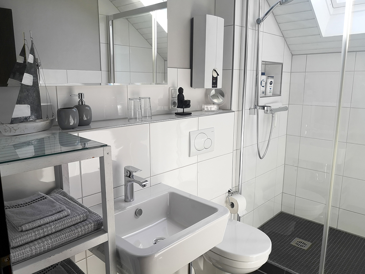 Das Schlafzimmer ist mit einem geräumigen Doppelbett (180×200) mit individuell verstellbaren Lattenrosten ausgestattet. Bettwäsche und zusätzliche Wolldecken – sofern es einmal besonders kalt werden sollte – werden gestellt. Über die Diele erreichen Sie das Bad mit großzügiger Dusche, Waschbecken und WC. Zur Ausstattung gehören ein Fön und die benötigten Hand- und Duschtücher.